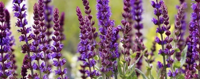 - Salbei (Salvia spp.) – Eine mehrjährige Zierpflanze mit violetten Blütenständen, die Bienen und Schmetterlinge anlockt. Er wächst am besten an sonnigen Standorten.
