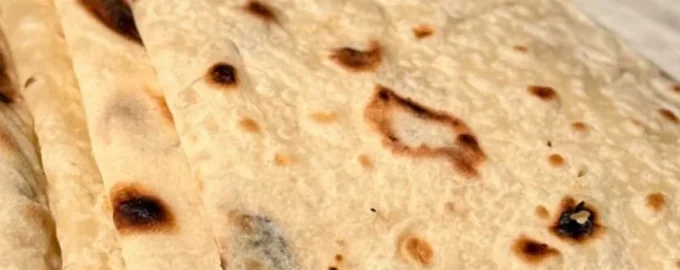 - Den Teig in 8 gleichmäßige Stücke mit einem Gewicht von je ca. 100 g teilen, dünn ausrollen und auf einem umgedrehten, erhitzten Backblech von beiden Seiten ausbacken, wie im Video gezeigt.