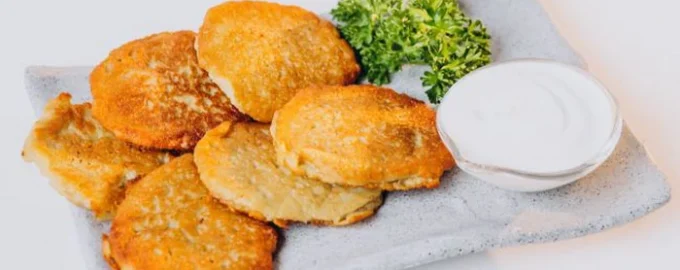 Zu diesem Gericht passt eine Soße, für die man saure Sahne, Senf, Knoblauch und grüne Zwiebeln mischt.