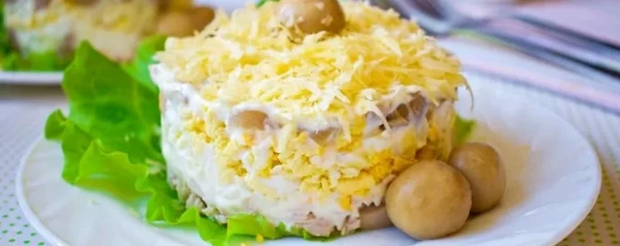 Sie benötigen 300 g Pilze (gekocht oder gebraten), 4 gekochte Eier und 200 g Hartkäse. Diese Kombination von Produkten ergibt ein perfektes Gleichgewicht von Zartheit, Nährwert und Geschmack.